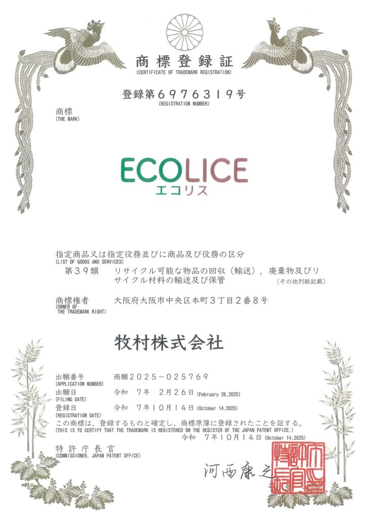 このたび、牧村株式会社が展開する「ECOLICE(エコリス)」につきまして、特許庁より商標登録されましたことをお知らせいたします。